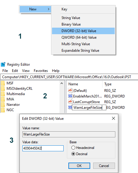 To increase the maximum size of pst-files and ost-files in Outlook, you’ll need to create and set 2 values in the following location in the Registry;